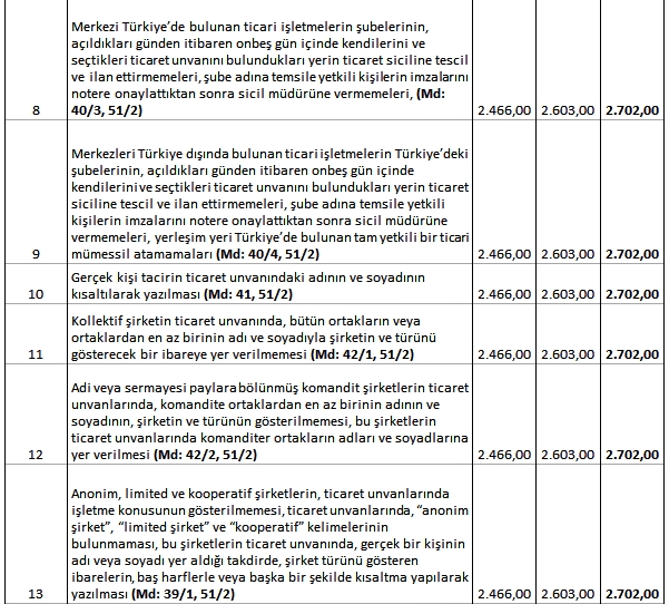 Türk Ticaret Kanunu’nun muhtelif maddelerinde sözü edilen idari para cezaları her yıl değişmektedir. Aşağıya 2015, 2016 ve 2017 yıllarına ilişkin idari para cezalarının dayanağı olan Türk Ticaret Kanunu’ndaki madde numaraları ve uygulanacak idari para cezalarının tutarları çıkartılmıştır.