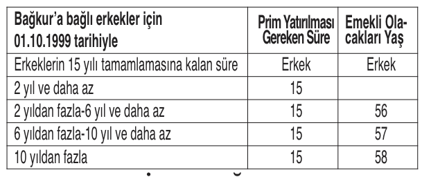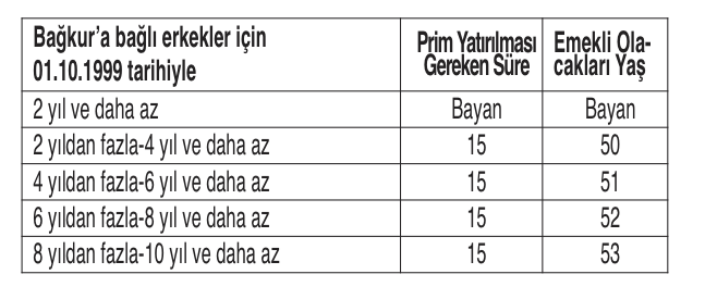 01.10.1999 tarihinden itibaren 23 yıllık sigortalılık süresini doldurmuş olan erkek çalışanlar emekli olabilmek için emeklilik yaşlarının gelmesini beklemek zorunda değiller. Fakat sadece bu yoldan emekli olmak zorunda değiller. 23 yıllık sigortalılık süresini doldurmamış olan çalışanlar 55 yaşına geldikleri zaman ve 15 yıllık sigortalılık sürelerini doldurdukları halde 5400 güne tabi olmak zorunluluğuyla kısmi emekli olma hakkını kazanırlar. Bu emeklilikle ilgili aşağıda sizlerle paylaşmış olduğumuz BAĞ-KUR emeklilik tablosuna bakarak emeklilik yaşınızı öğrenebilirsiniz.