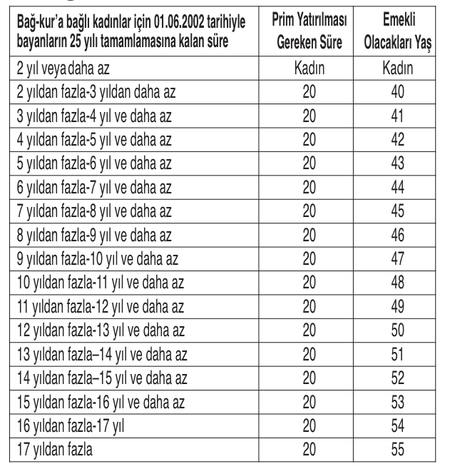 Kadınlar İçin BAĞ-KUR Emeklilik Tablosu