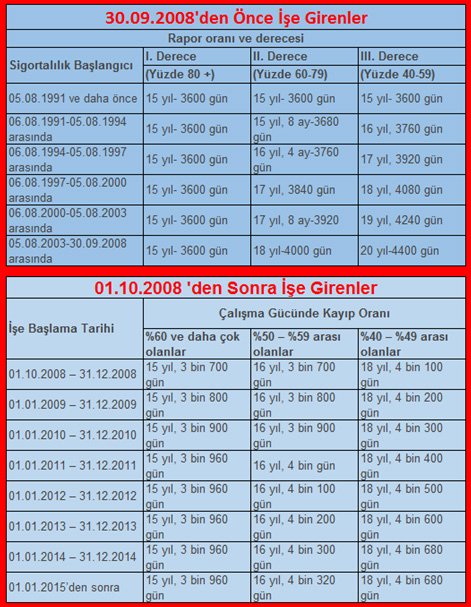 · Çalışma Gücünde Kayıp Oranı yüzde %60 ve daha çok olanlar: 15 yıl, 3960 gün sigortalılık süresi