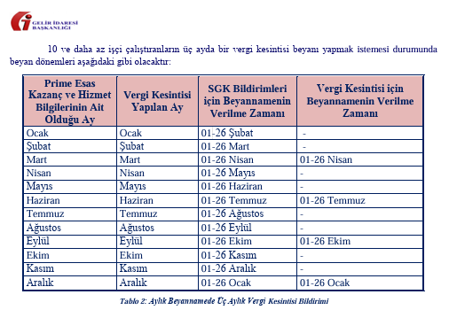 Ayrıca Kılavuzda devamla 10 ve daha az işçi çalıştıranların üç ayda bir vergi kesintisi beyanı yapmak istemesi durumunda beyanların 3 aylık bildirilebileceği bilgisine yer verilmiştir.