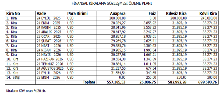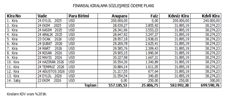 ÖRNEK ÖDEME PLANINA GÖRE LEASİNG MUHASEBE KAYDI: