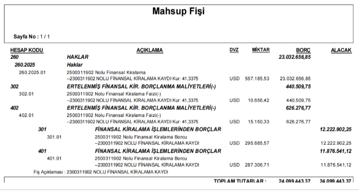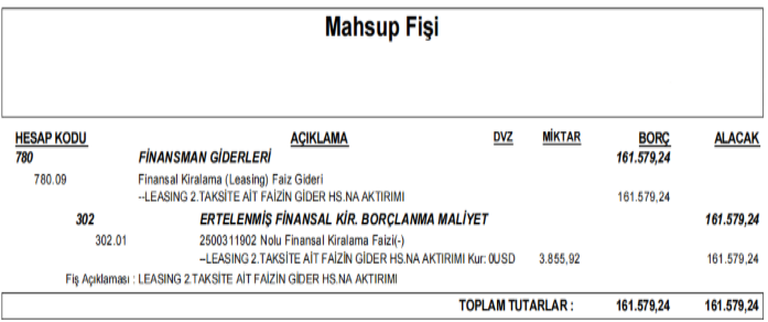 2025 yılına ait faiz tutarlarının kaydedildiği 302 hesap kesilen leasing faturası ile ilgili aya ait tutarı kadar alacaklandırarak taksit süresi boyunca kapatılıp ilgili 780 hesapta giderleştirilir.