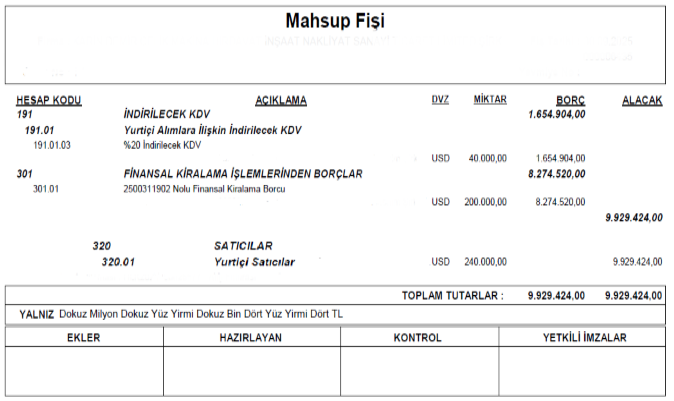 Anapara ve faizin tutarlarının toplamının kaydedildiği 301 muhasebe kodu, kesilen faturada kira matrahı kadar olan bedel ters kayıt ile kapatılıp KDV indirim konusu yapılarak kaydedilir.
