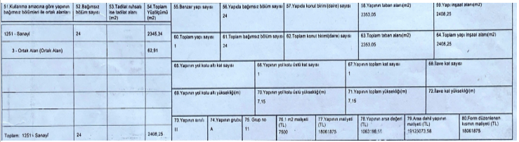 Yapı Ruhsatının bu kısmında ise Toplam alan kısmı ve Yapının Sınıfı ve grubu önemlidir. İnşaat maliyetleri burada ki toplam alan dikkate alınarak hesaplanır. Yapının Sınıfı ve grubu kısmı ise hem KDV oranı belirler iken hem asgari işçilik hesaplanırken hem de bu Ruhsat ile ne iş yapacağımızı gösteren en detaylı alanı içerir.