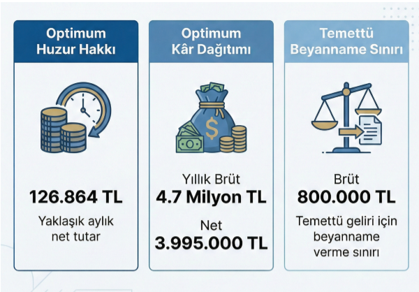 - Şirketin az ödediği kurumlar vergisi ile huzur hakkı ödemek için katlandığı gelir vergisinin eşit olduğu tutara optimum huzur hakkı tutarı diyoruz. 2026 yılı optimum huzur hakkı tutarı aylık net yaklaşık 126.864,03 TL