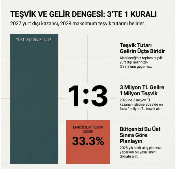 - Örnek: Diyelim ki süreniz bitti ve 1/3 kuralı sizin için işlemeye başladı. Eğer 2027 yılında yurt dışından toplam 3.000.000 TL gelir elde ettiyseniz, 2028 yılı içinde onaylanıp size ödenecek teşviklerin toplamı en fazla 1.000.000 TL olabilir.