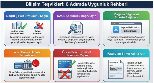 - Doğru Nace Kodu ile Kurulmuş Olmak: Teşvik başvurusu sırasında şirketin NACE kodunu ve ana sözleşmesini inceleyerek gerçekten bilişim alanında faaliyet gösterdiğini teyit ediyor.