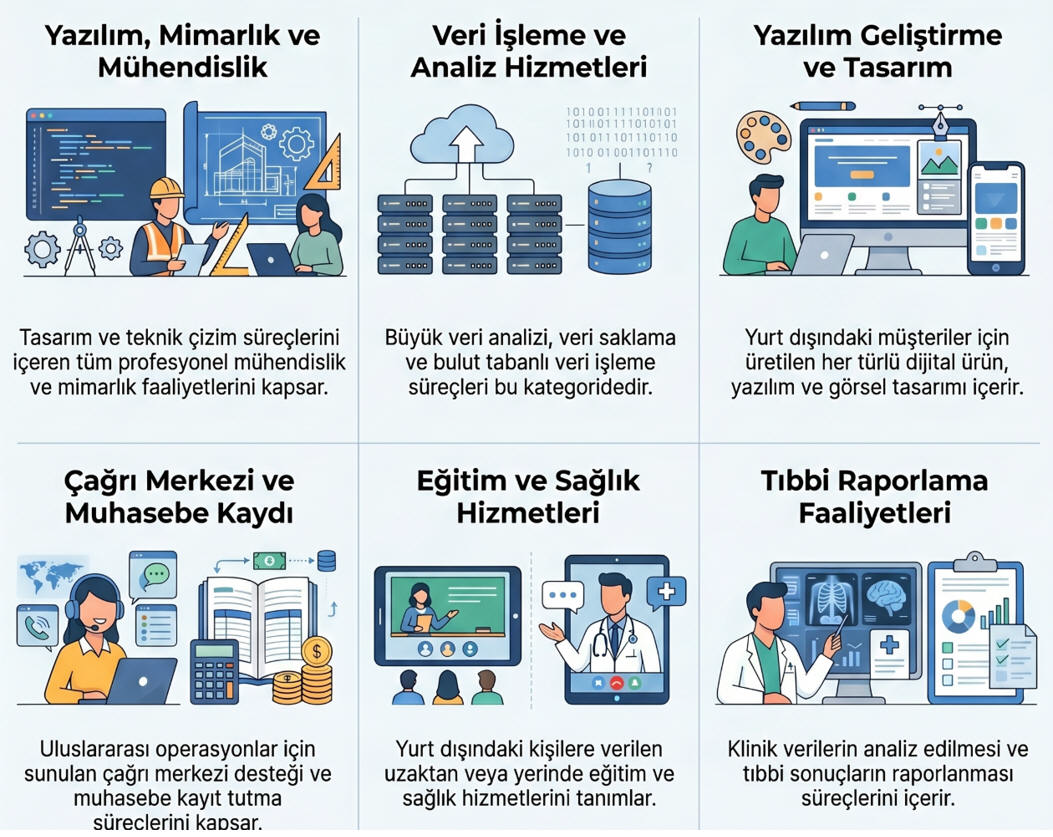 - Kapsamdaki Hizmetler: Mimarlık, mühendislik, tasarım, yazılım, tıbbi raporlama, muhasebe kaydı tutma, çağrı merkezi, veri saklama, veri işleme, veri analizi ve yurt dışındaki kişilere verilen eğitim/sağlık hizmetleri bu kapsamdadır.