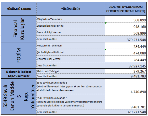 5549 sayılı Kanun’un 13’üncü maddesinin 1’inci fıkrasına göre aynı kanunun 3’üncü maddesinde yer alan müşterinin tanınması, 6’ncı maddesinde yer alan devamlı bilgi verme yükümlülüğünün her bir ihlalinde 30.000 TL; ve 4’üncü maddesinin 1’inci fıkrasında yer alan şüpheli işlem bildirimi yükümlülüğünün her bir ihlalinde 50.000 TL idari para cezaları yükümlüye 5326 sayılı Kanun’un 17/7 maddesi uyarınca yeniden değerleme oranında bu maktu idari para cezası tutarları her takvim yılı başından geçerli olmak üzere artırılarak Başkanlığımız tarafından kesilir. Yükümlünün banka, finansman şirketi, faktoring şirketi, ikrazatçı, finansal kiralama şirketi, sigorta ve reasürans şirketi, emeklilik şirketi, sermaye piyasası kurumu, yetkili müessese, ödeme ve elektronik para kuruluşu ile yönetmelikle belirlenecek diğer finansal kuruluşlar olması hâlinde, işlem tutarının yüzde beşinden az olmamak üzere iki kat oranında idari para cezası bu yükümlülere her bir yükümlülük ihlali için kesilir. Ayrıca 5549 sayılı Kanun’un 13’üncü maddesinin 5’inci fıkrasına göre her bir müşterinin tanınması, şüpheli işlem bildirimi ve devamlı bilgi verme yükümlülüğü ihlali dolayısıyla kesilen idari para cezasının toplam tutarı; ihlalin yapıldığı yıl itibarıyla iki kat idari para cezası kesilecek yükümlüler için 40 milyon Türk lirasını, bunlar dışında kalan yükümlüler için 4 milyon Türk lirasını aşamaz.