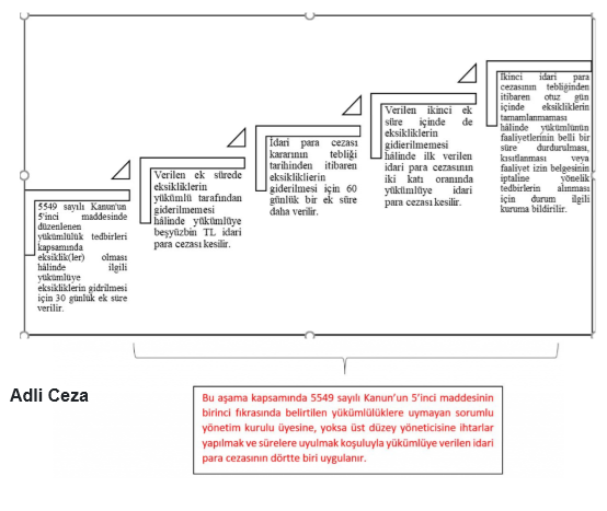 5549 sayılı Kanun’un 13’üncü maddesine göre 5549 sayılı kanunun 5’inci maddesinde belirtilen Uyum Yönetmeliği’nde düzenlenen tedbirlere yükümlüler tarafından uyulmaması hâlinde yükümlüye uygulanacak yaptırım prosedürü şu şekildedir: