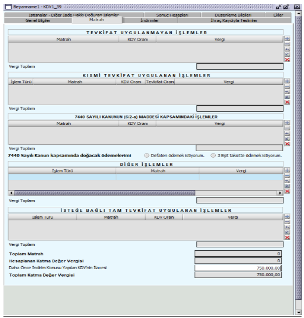 KDV beyannamesi hazırlanırken dikkat edilecek bir diğer önemli husus ise taşınmaz nedeniyle yüklenilen KDV’nin devrin yapıldığı döneme kadar indirilemeyen kısım “İlave edilecek KDV” olarak beyan edilmesidir. Buna göre fabrika binasının inşaası nedeniyle yüklenilen ancak devrin yapıldığı döneme kadar indirim yoluyla giderilemeyen KDV tutarı olan 750.000,00 TL KDV1 beyannamesinin matrah kulakçığında “Daha Önce İndirim Konusu Yapılan KDV’nin İlavesi” kısmında beyan edilerek matraha ilave edilecektir.