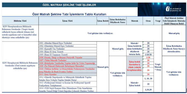 KDV Hesaplamaksızın Bildirimde Bulunması Gerekenler kısmını vergisi önceki safhalarda beyan edilerek ödenen özel matrah uygulanan mal ve hizmetleri nihai tüketiciye satan mükellefler için, KDV Hesaplayarak Bildirimde Bulunması Gerekenler kısmı ise özel matrah uygulayan mükellefler için doldurması gerekmektedir.