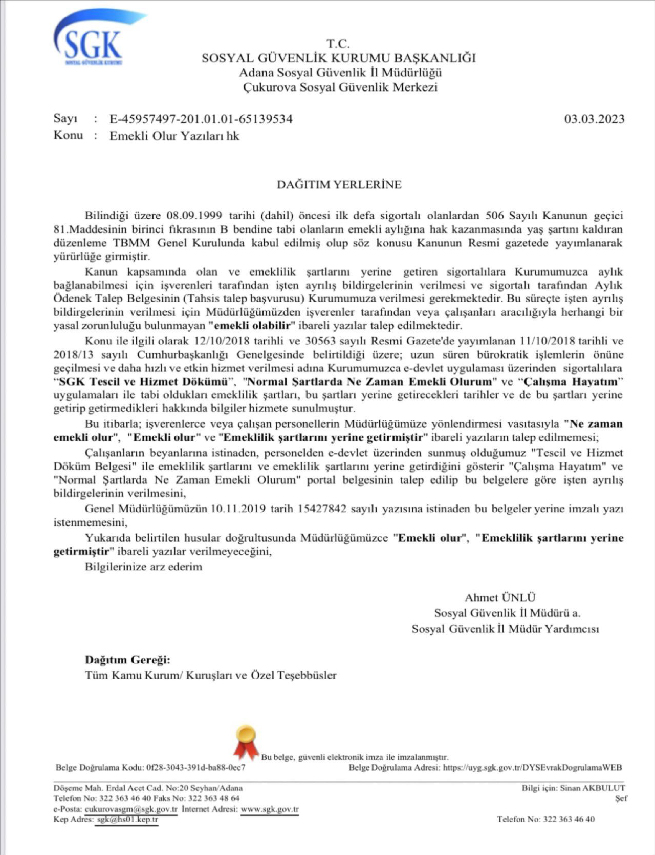 Bu itibarla; işverenlerce veya çalışan personellerin Müdürlüğümüze yönlendirmesi vasıtasıyla "Ne zaman emekli olur", "Emekli olur" ve "Emeklilik şartlarını yerine getirmiştir" ibareli yazıların talep edilmemesi;