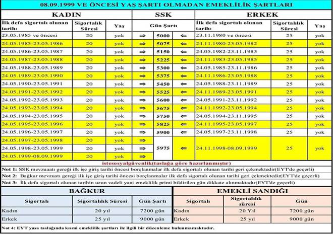 Sigortalıların sigortalılık süresi kadınlarda 20 yıl, erkeklerde 25 yıl olarak, Sigortalıların işe giriş tarihlerine göre 5 bin gün ile 5 bin 975 gün arasında gün şartı korunmuş durumda.