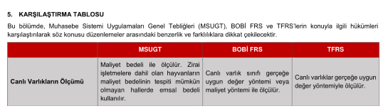 Muhasebe Sistemi Uygulamaları Genel Tebliğleri (MSUGT), BOBİ FRS ve TFRS’lerin konuyla ilgili hükümleri karşılaştırılarak söz konusu düzenlemeler arasındaki benzerlik ve farklılıklara ilişkin tablo;