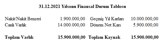 31 Aralık 2021 tarihinde işletme yeni doğan 8 canlı varlık dahil canlı varlıkların değerini 14.000.000 TL olarak ölçmüştür.