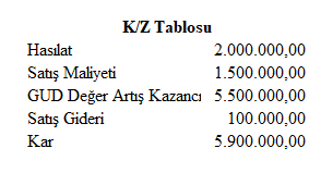 Bu durumda K/Z Tablosu;