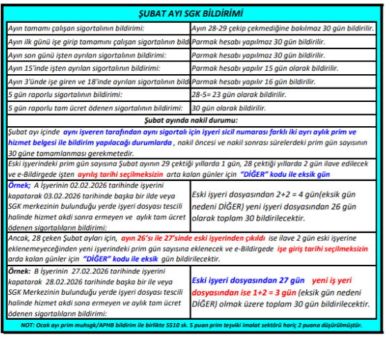 Şubat 2026 yılı MUHSGK eksik günler için ay kavramı 28 gün üzerinden işlem yapılacaktır.
