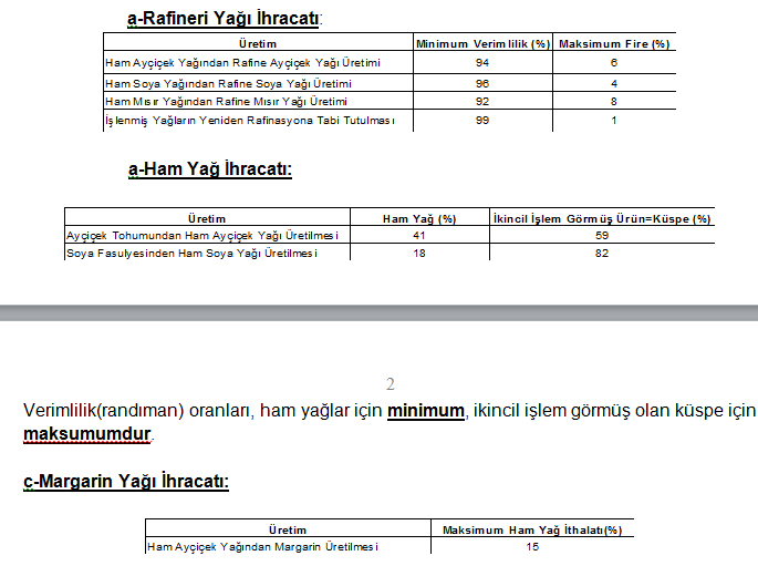 5-Bitisel yağ imalatında fire, kullanım ve verimlilik oranları aşağıdaki gibidir: